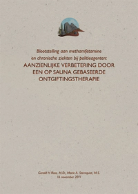 Achtergrond: De medische literatuur beschrijft de gezondheidsrisico’s die wetshandhavers lopen wanneer ze herhaaldelijk blootgesteld worden aan methamfetamine en stoffen die daarmee in verband staan. De meeste effecten zijn van voorbijgaande aard, maar sommige politieagenten in Utah die er tijdens hun werk aan waren blootgesteld, kregen chronische klachten die bij sommigen arbeidsongeschiktheid tot gevolg hadden. Dit rapport is een in kaart gebrachte willekeurige retrospectieve medische evaluatie van ambtenaren met chronische klachten. Ze volgden een ontgiftingsprogramma om die chronische klachten te verminderen en de kwaliteit van hun leven te verbeteren. Aanpak: 69 politieagenten namen deel aan het Utah Meth Cops Project en werden voor en na het behandelprogramma geëvalueerd; wat bestond uit geleidelijke opbouw van lichaamsoefeningen met de daarbij behorende voeding en saunatherapie. Evaluaties bestonden ook uit de resultaten van voor en na de behandeling van de Research and Development Corporation (RAND), een uit 36 vragen bestaand Gezondheidsonderzoeksformulier (SF-36) vergeleken met de groepsnormering van RAND, de resultaten voor en na behandeling van de hevigheid van symptomen, de neurotoxiciteitscijfers, de Mini-Mental Status Examination die de symptoomfrequentie weergeeft en een structurele evaluatie van de veiligheid van het behandelingsprogramma. Resultaten: statistisch gezien werd een aanzienlijke verbetering waargenomen in de SF-36 evaluaties, de waargenomen symptomen en het aantal gevallen van neurotoxiciteit. Het detoxificatieprotocol werd goed doorstaan, met een voltooiingspercentage van 92,8%. Conclusie: dit onderzoek laat duidelijk zien dat het gebruik van de sauna en voedingstherapie chronische symptomen kan verlichten die opkwamen nadat men aan chemische stoffen was blootgesteld die voortkwamen uit beroepsmatig contact met methamfetamine. Dit rapport heeft ook betrekking op de nadelige effecten bij blootstelling aan andere complexe chemische stoffen. Gezien de positieve klinische resultaten van deze groep, lijkt een grondiger onderzoek van deze op sauna gebaseerde behandeling gerechtvaardigd.